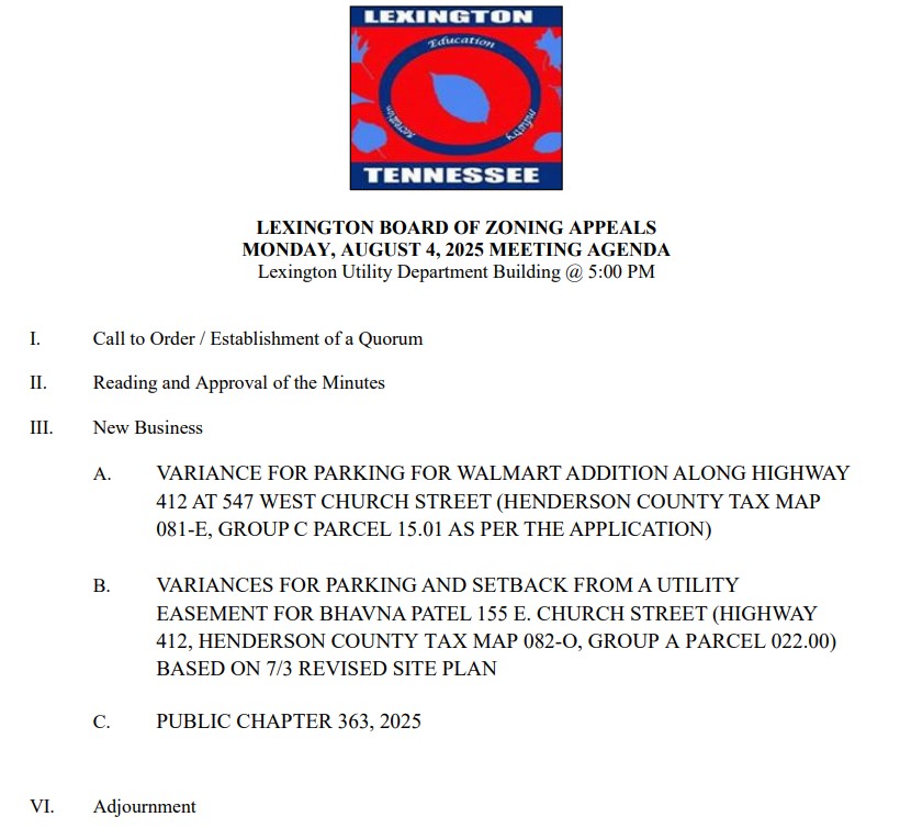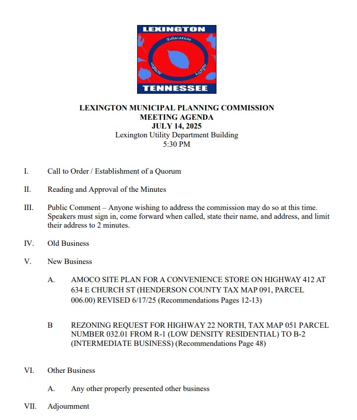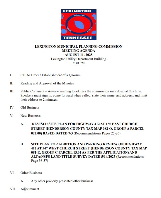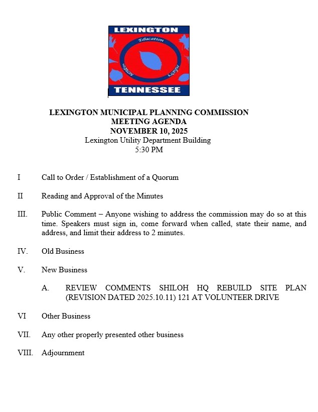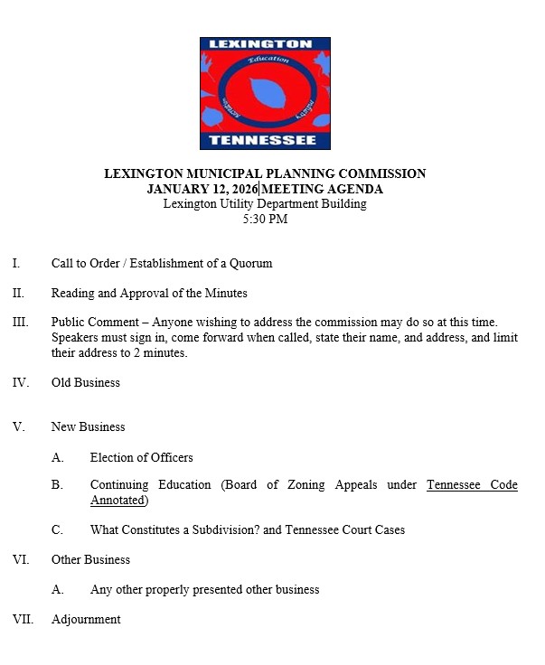 The Planning Commission meets on the second Monday of each month at 5:30 p.m. All Planning Commission meetings will take place at the Lexington Utilities Operations Facility located at 180 Maple Street, Lexington, TN.