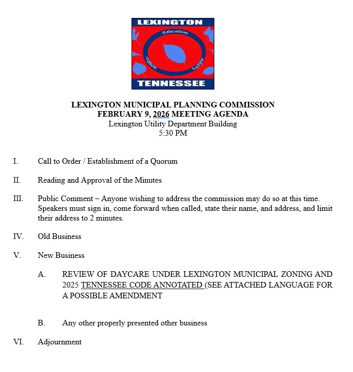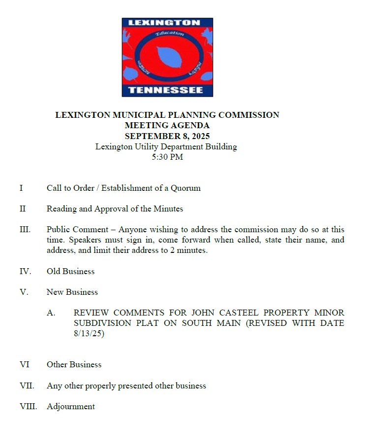 The Planning Commission meets on the second Monday of each month at 5:30 p.m. All Planning Commission meetings will take place at the Lexington Utilities Operations Facility located at 180 Maple Street, Lexington, TN.